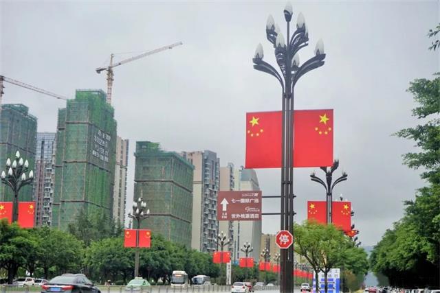 每隔幾十米的路燈燈柱上都懸掛著兩面五星紅旗,